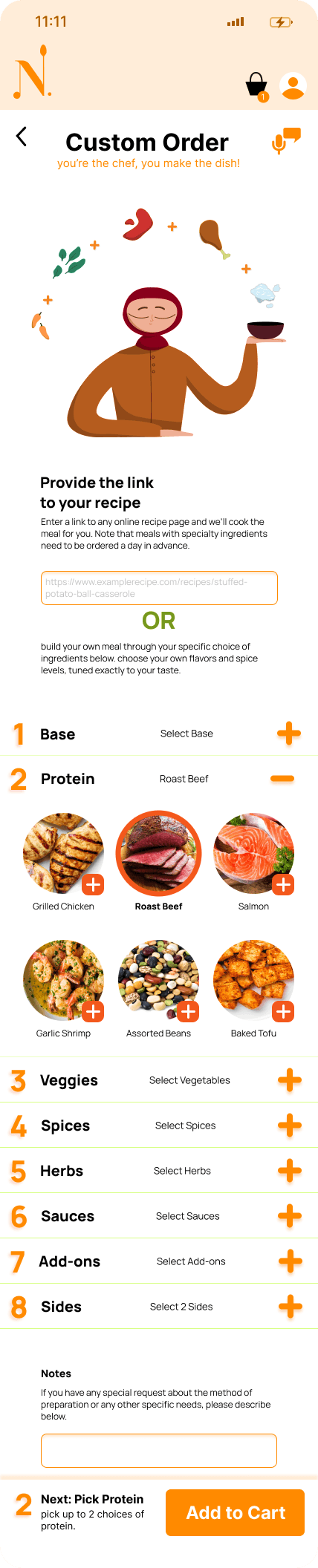 feature ability to customize entire meal manually or through a recipe upload and other instructions, allowing users access to a virtual kitchen to cook any meals based on needs, wants, and preferences