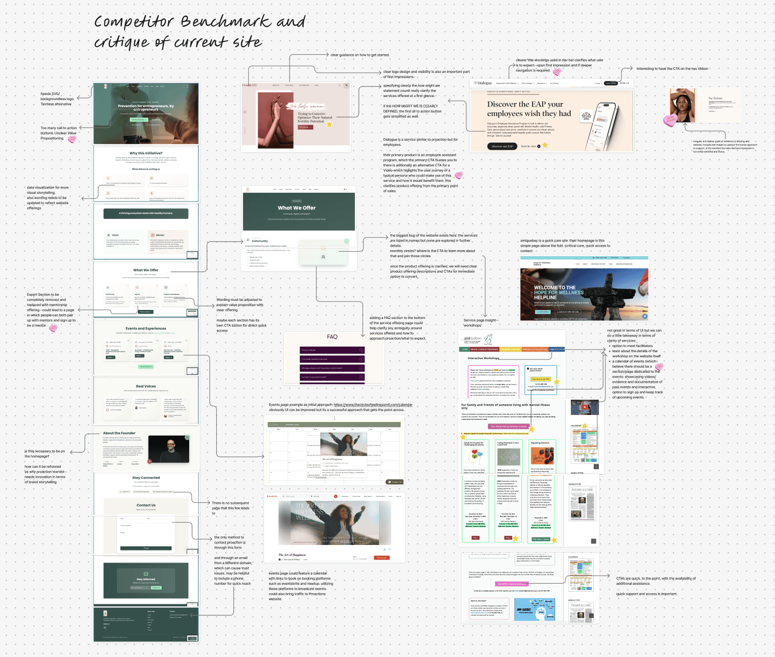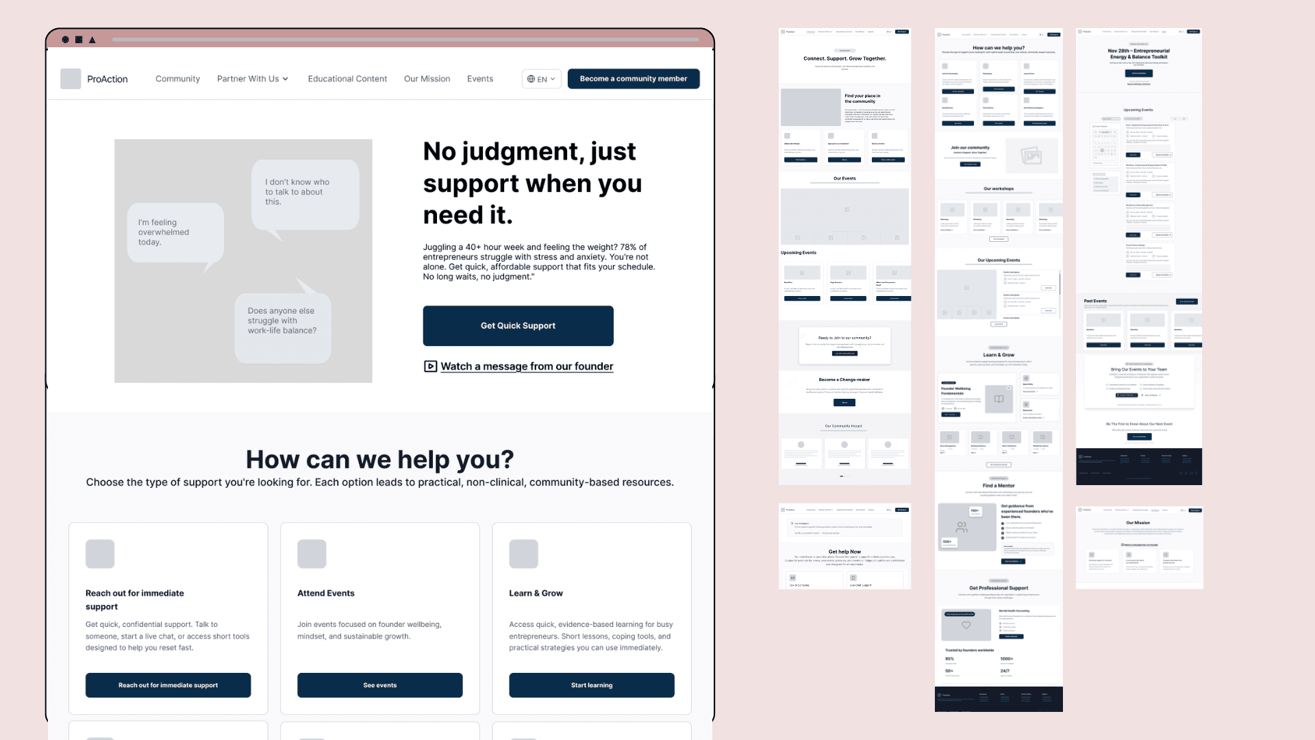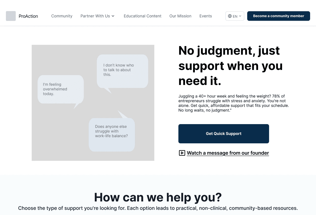 ProAction Entrepreneur brought our team on board with a broad mandate: Develop a Research and Design Strategy to directly inform how they position themselves in the market as an entry level wellness startup geared toward entrepreneurs, clarify their value offering, and build trust to increase conversion while ensuring every decision is rooted in creating a digital environment to foster entrepreneur wellbeing, normalizing the taboo of support seeking.