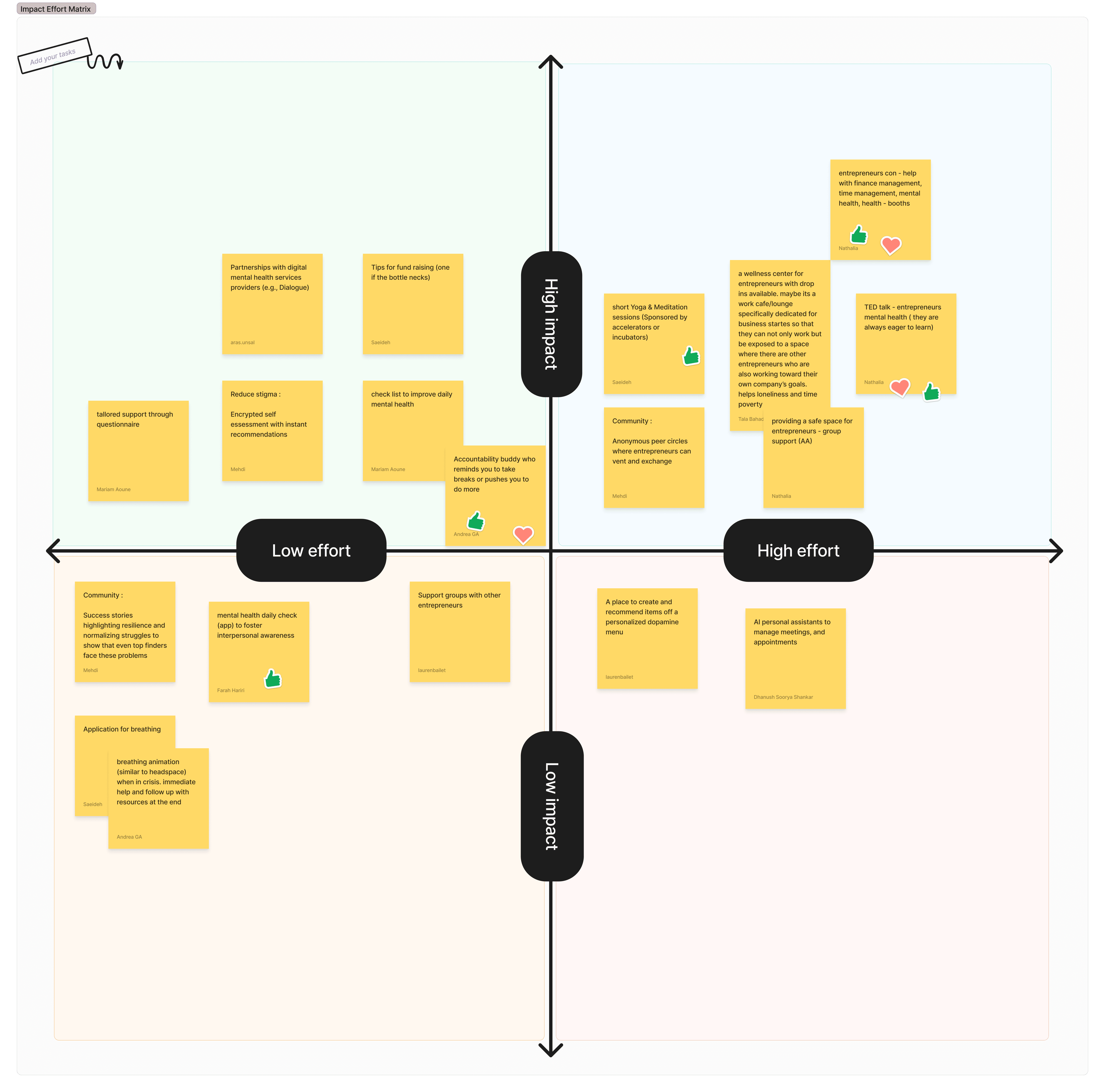 We then moved into a round of individual ideation and solution mapping. Here, I clustered the design workshop findings into themes and assessed them through an impact-effort matrix to identify the most viable directions.