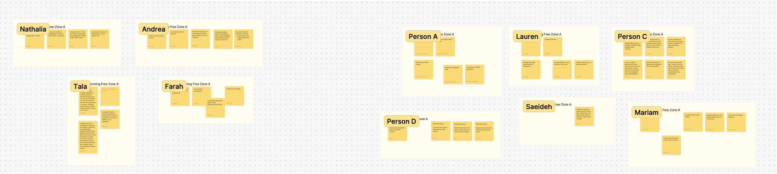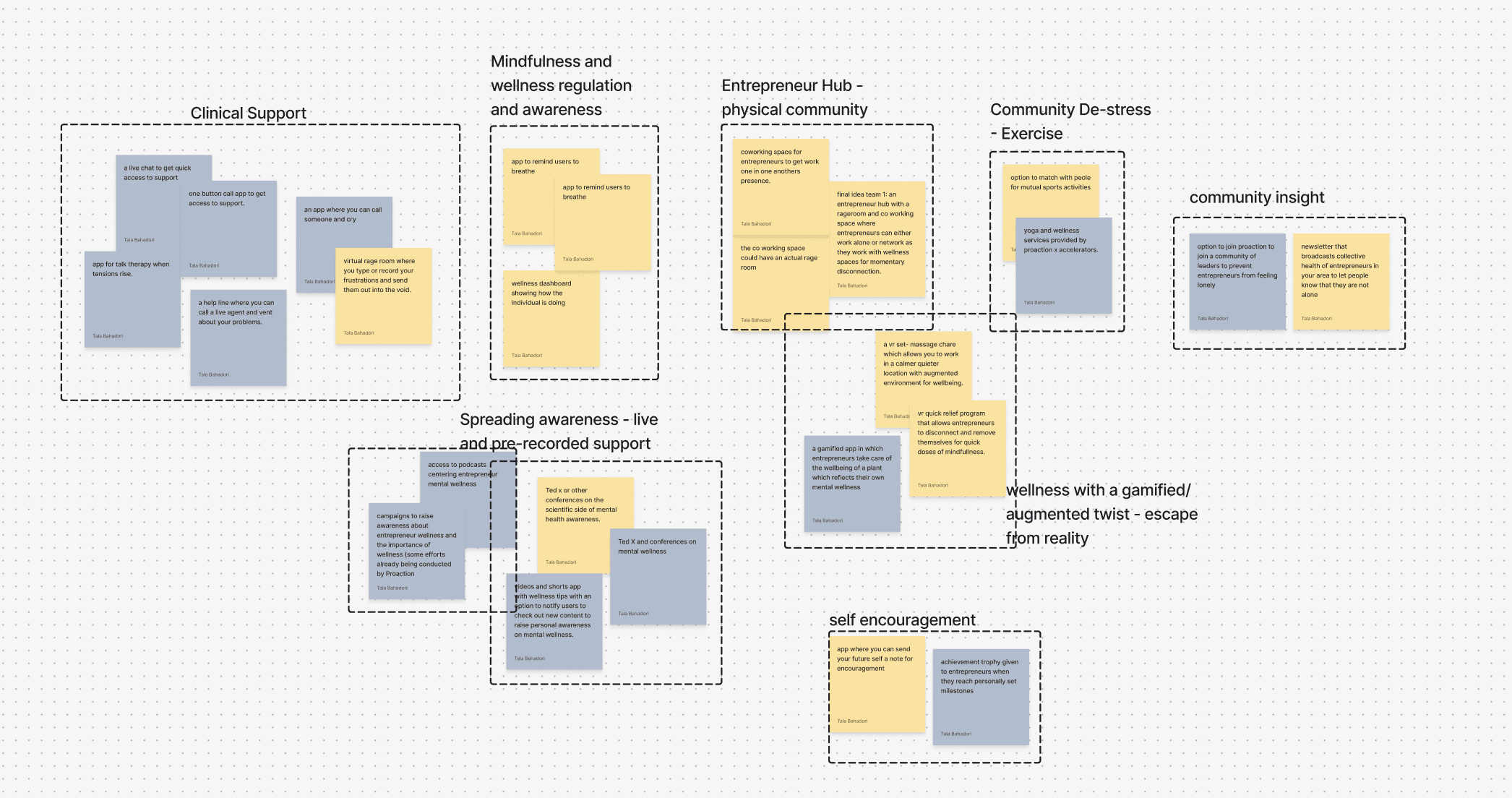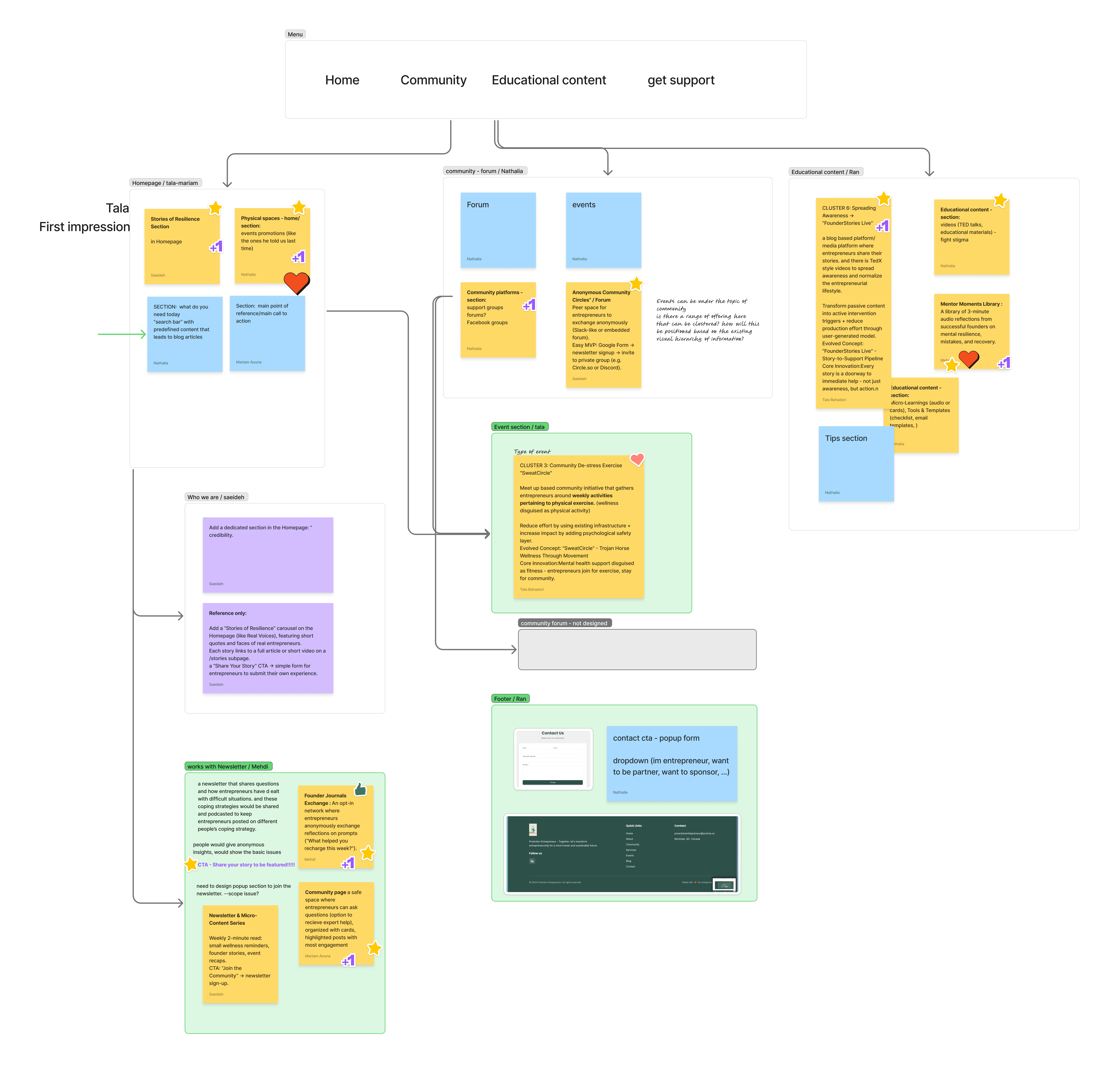 Ideas compiled after our second round of individual solution modeling sessions that we voted on keeping were reorganized and mapped into a potential model for the information architecture design of the site. This visual design session helped us create a clear guide on how we were to logically group idea clusters to consolidate the site map.