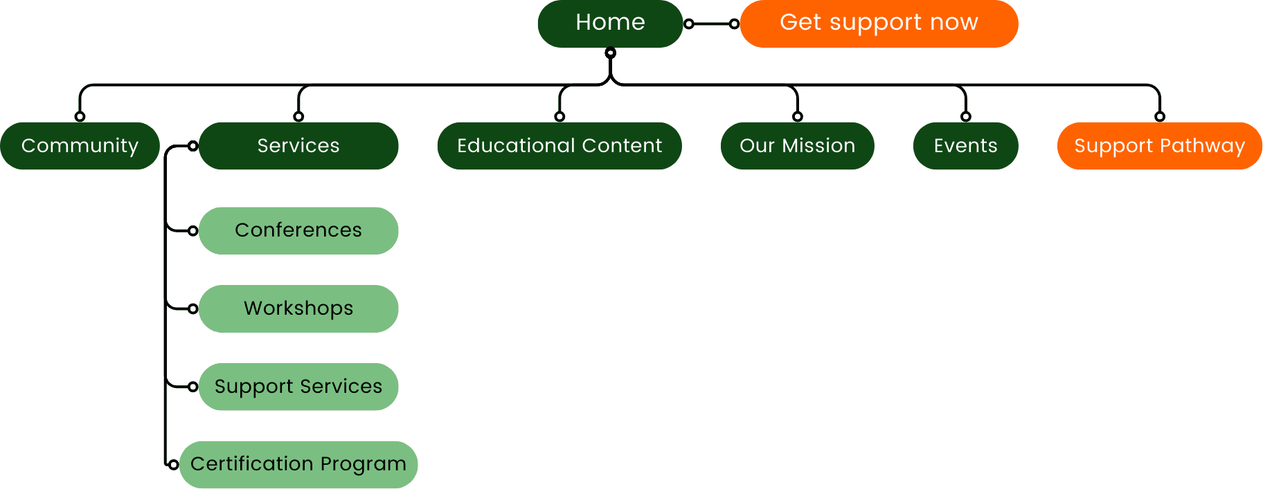 The final pretested sitemap involved two main CTAs for support: one leading entrepreneurs towards all support pathways and the other for getting immediate support during crisis as well as a vertical service flow for B2Bs under the services tab.